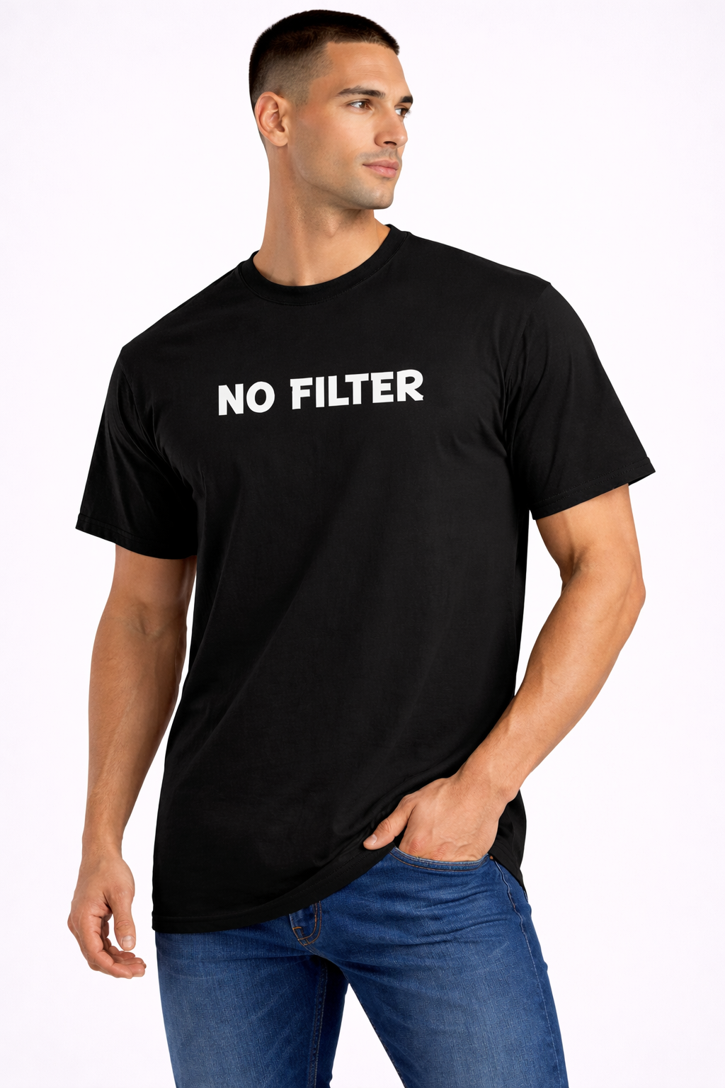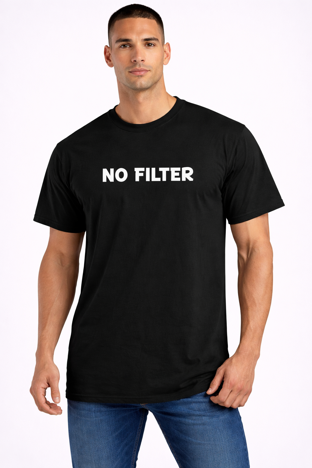 This bold black graphic T-shirt is designed for those who like to keep it real and unapologetically expressive. The back features a fun “NO FILTER” drip-style typography in rich brown and cream tones, paired with a playful cartoon illustration that adds a quirky street-style vibe. Made from soft, breathable fabric with a comfortable fit, this T-shirt is perfect for daily wear, casual outings, college looks, and urban fashion lovers.
