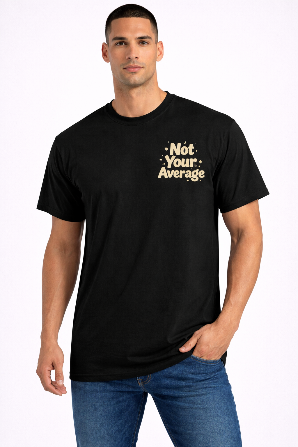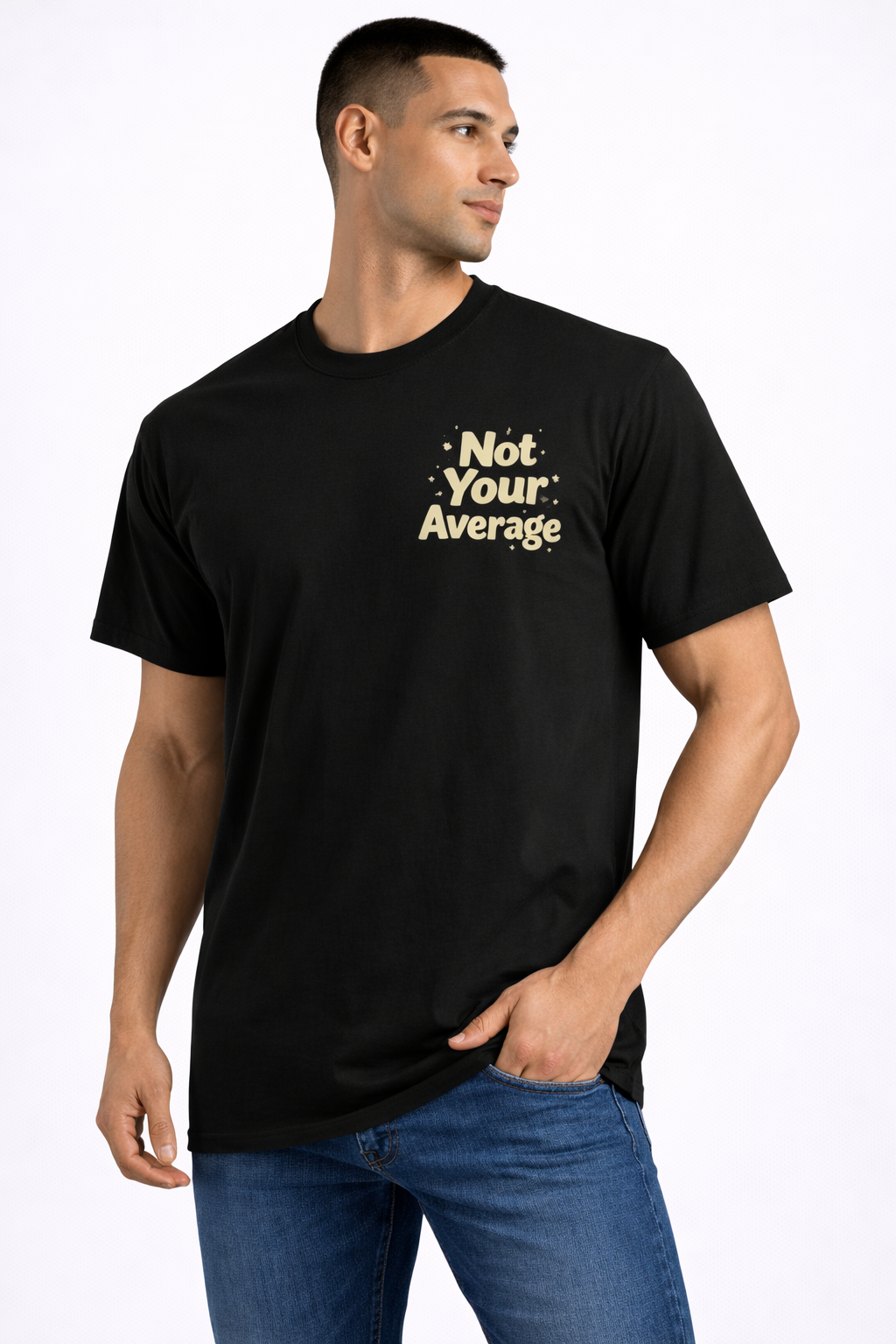 This stylish black graphic T-shirt is made for those who like to stand out from the crowd. The back features a bold “Not Your Average” typography print in a soft cream tone, creating a strong yet minimal statement look. Designed with premium-quality fabric and a comfortable fit, this T-shirt is perfect for everyday wear, casual outings, college, and street-style fashion.