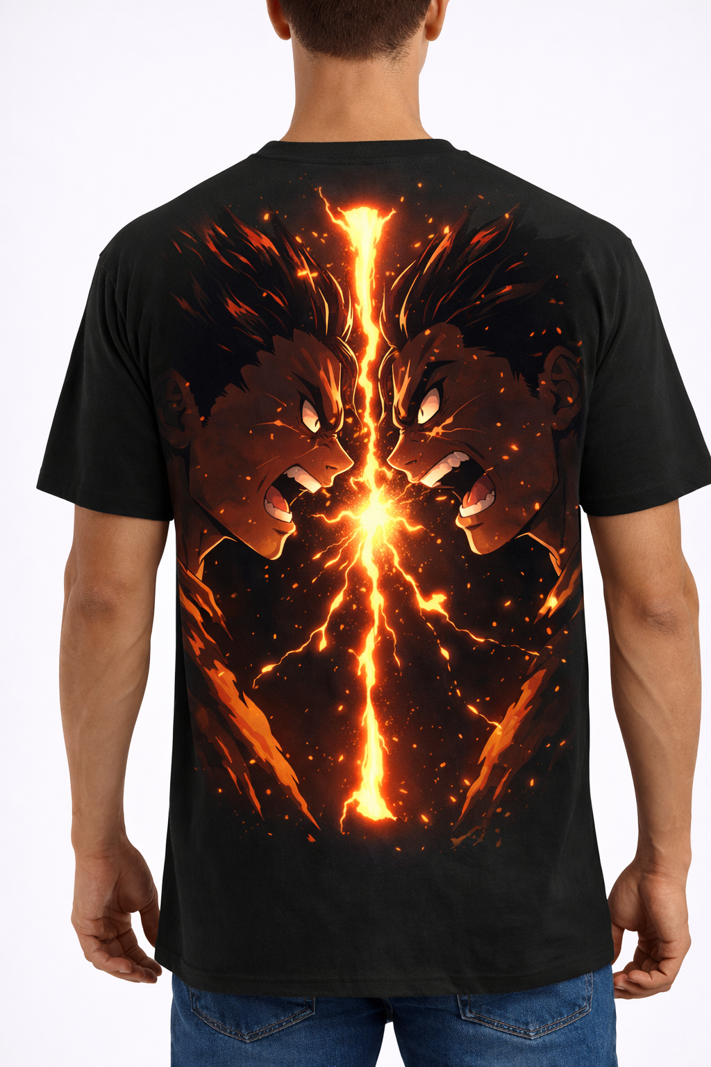 The Volcanic Fury Anime Graphic T-Shirt is a bold and electrifying streetwear piece designed for anime and action-art enthusiasts. The back of this black T-shirt features a powerful molten lava-inspired character design, highlighted with intense fiery cracks and glowing magma effects that create a dramatic and eye-catching look.